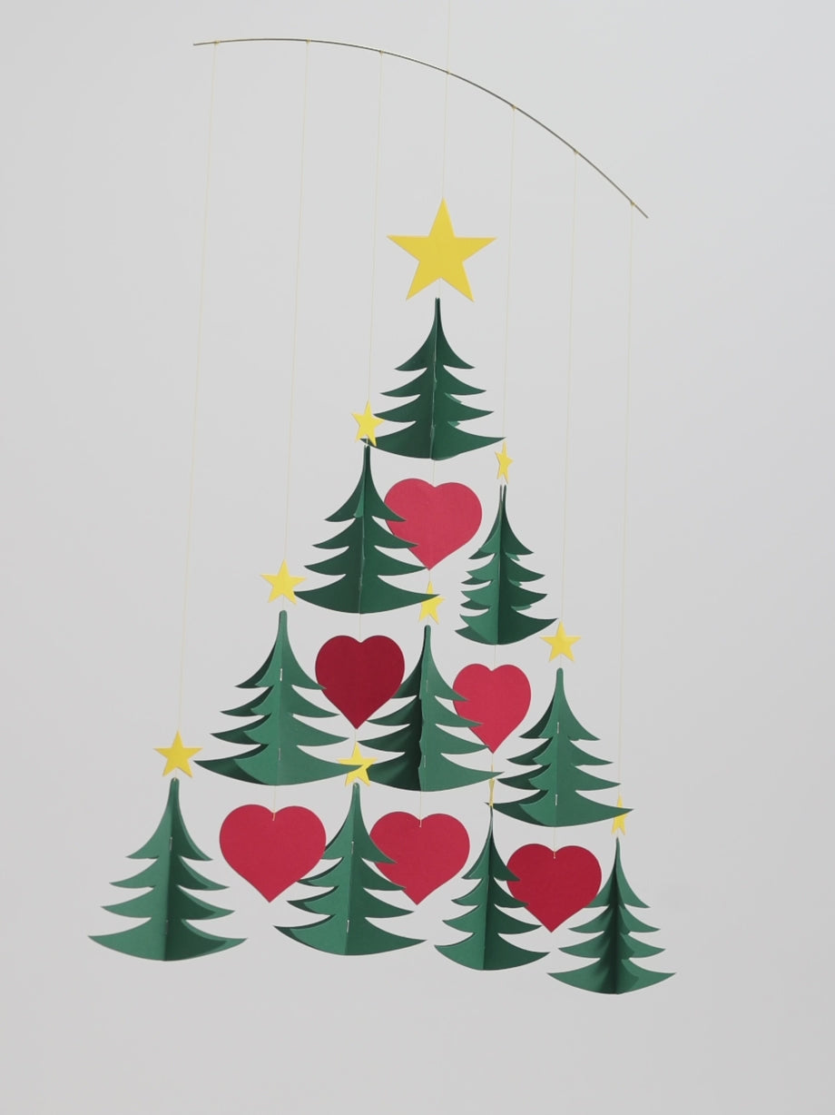 Christmas Trees 10, created by Ole Flensted in 1982, combines six small Christmas trees to artistically form a larger tree, adorned with hearts and a star. This design beautifully symbolises the festive spirit and the joy of giving during the holiday season. It makes the perfect Christmas decoration to hang in your window, living room, bedroom, kitchen, children's room, or office.