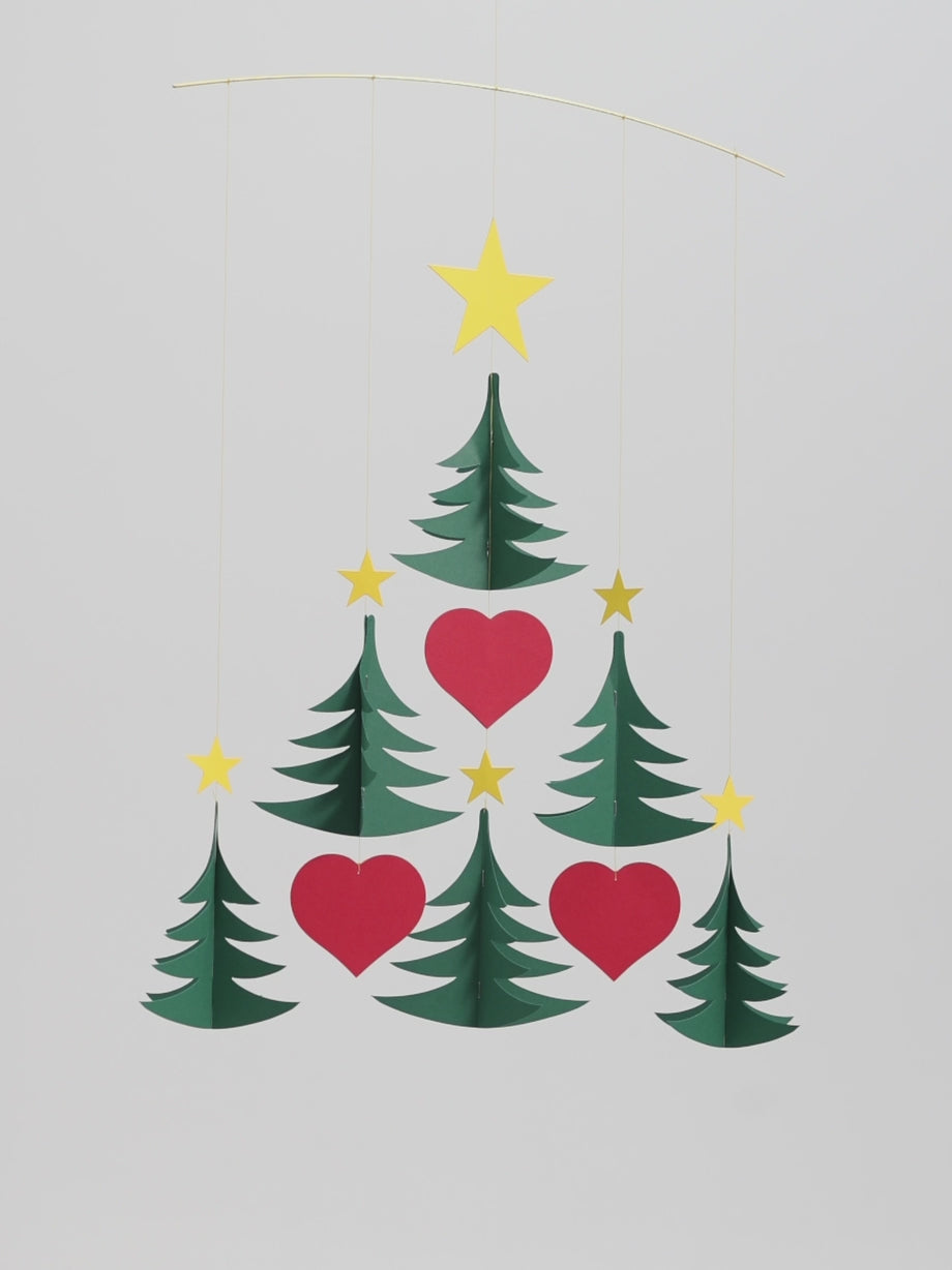 Christmas Trees 6, created by Ole Flensted in 1982, combines six small Christmas trees to artistically form a larger tree, adorned with hearts and a star. This design beautifully symbolises the festive spirit and the joy of giving during the holiday season. It makes the perfect Christmas decoration to hang in your window, living room, bedroom, kitchen, children's room, or office.