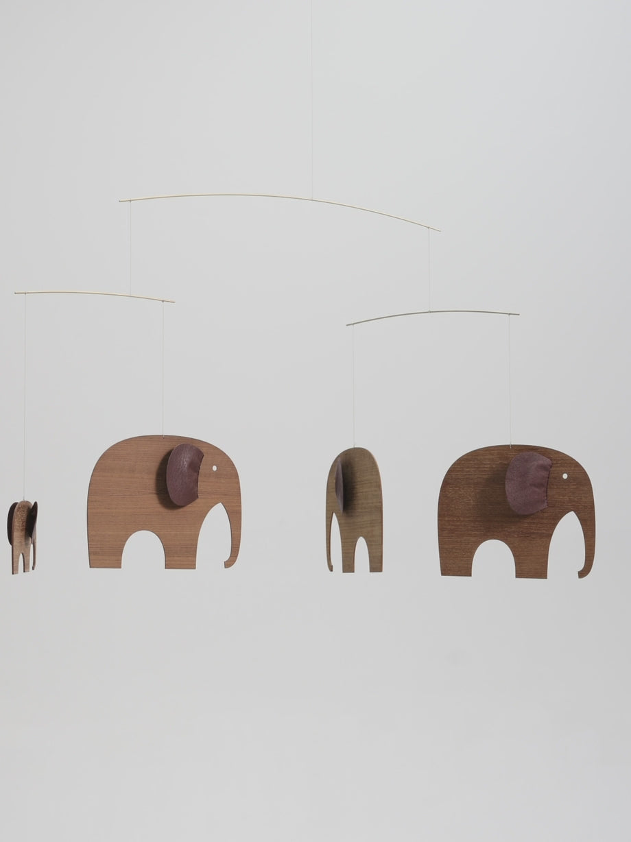 Elephant Herd 4 | Wood is a luxurious mobile crafted from walnut wood, leather, and gold-plated stainless steel bars. The premium materials ensure that the mobile will remain stunning for years to come. It is beautiful hanging object ideal for many rooms in your home— from the living room and bedroom to the children's room and hallway.