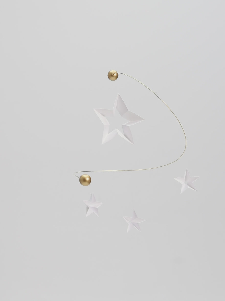 Starry Night 4 features stars of various sizes in three-dimensional shapes, centred around a brass hub with golden globes at each end, creating a dynamic visual experience as they rotate. This modern Scandinavian Christmas decoration will look beautiful in any home.